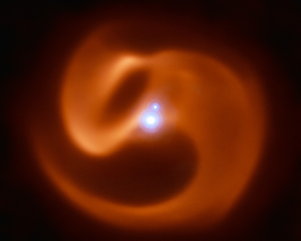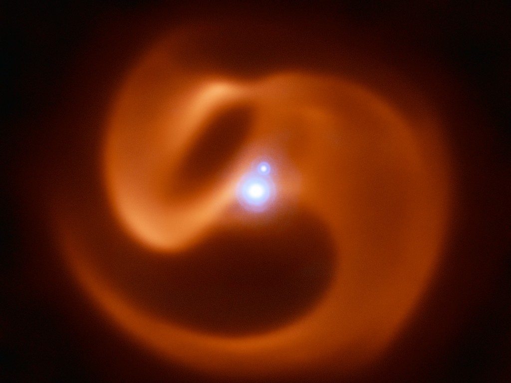 This photograph of space shows a cloud of gas and dust in space being twisted into this swirling shape by two giant stars. Both stars are what we call "Wolf-Rayet stars", famous for being some of the biggest and hottest stars, and for blowing out powerful winds.