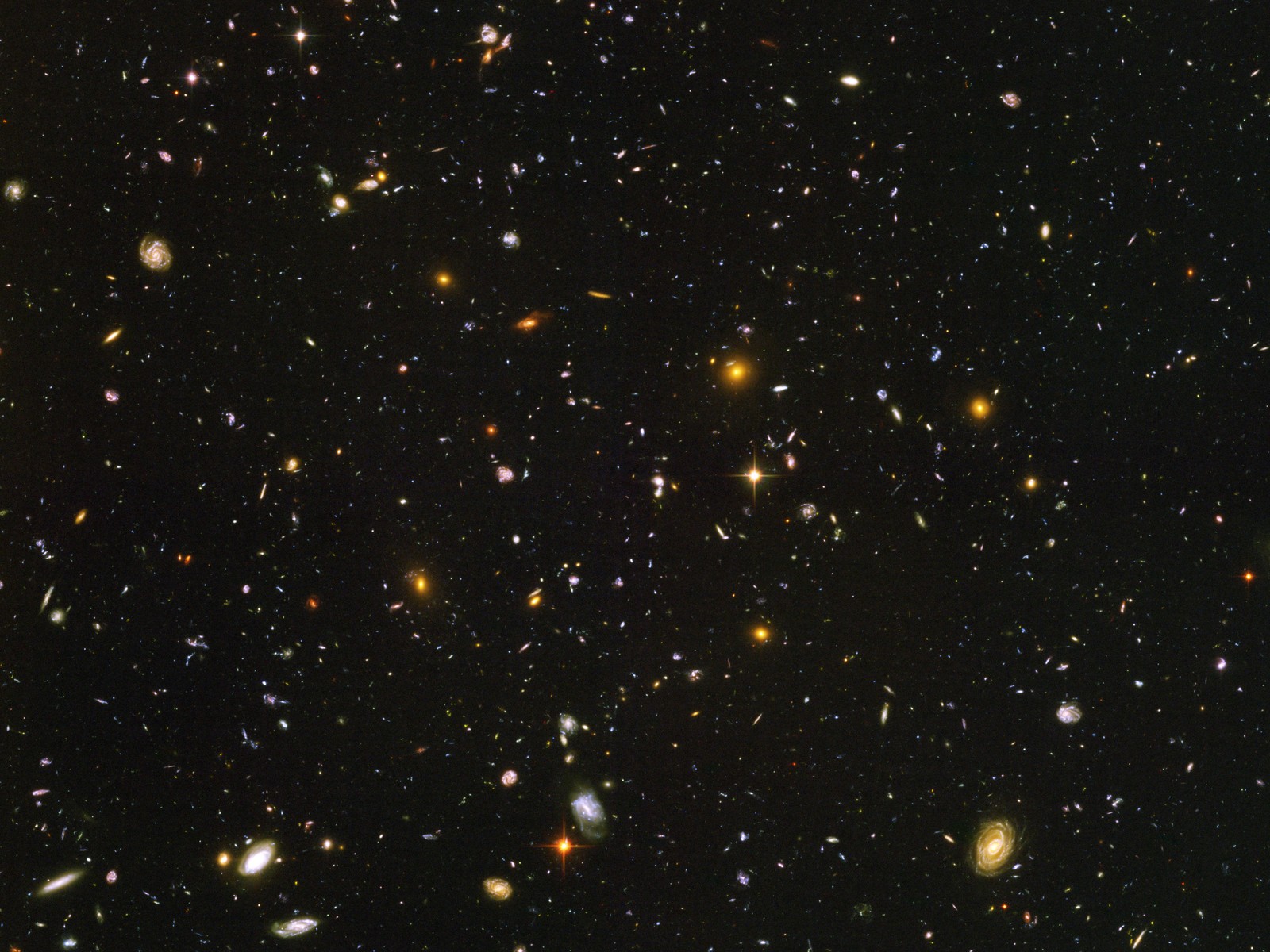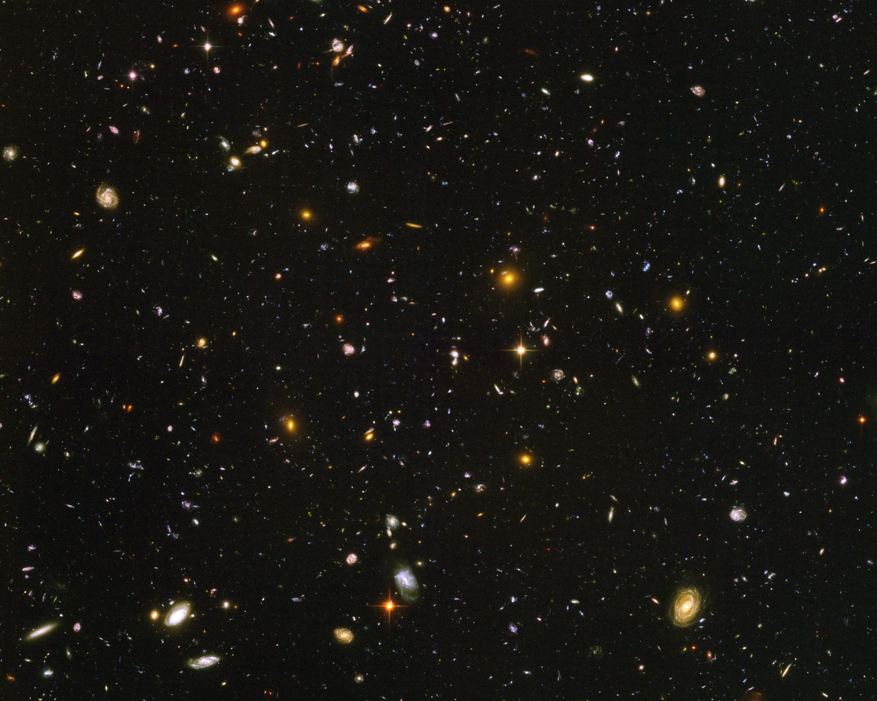 To create this picture the Hubble Space Telescope was pointed at a region of the night sky non-stop for 35-hours. Look closely and you'll see the picture contains thousands of gigantic, star-filled galaxies!
