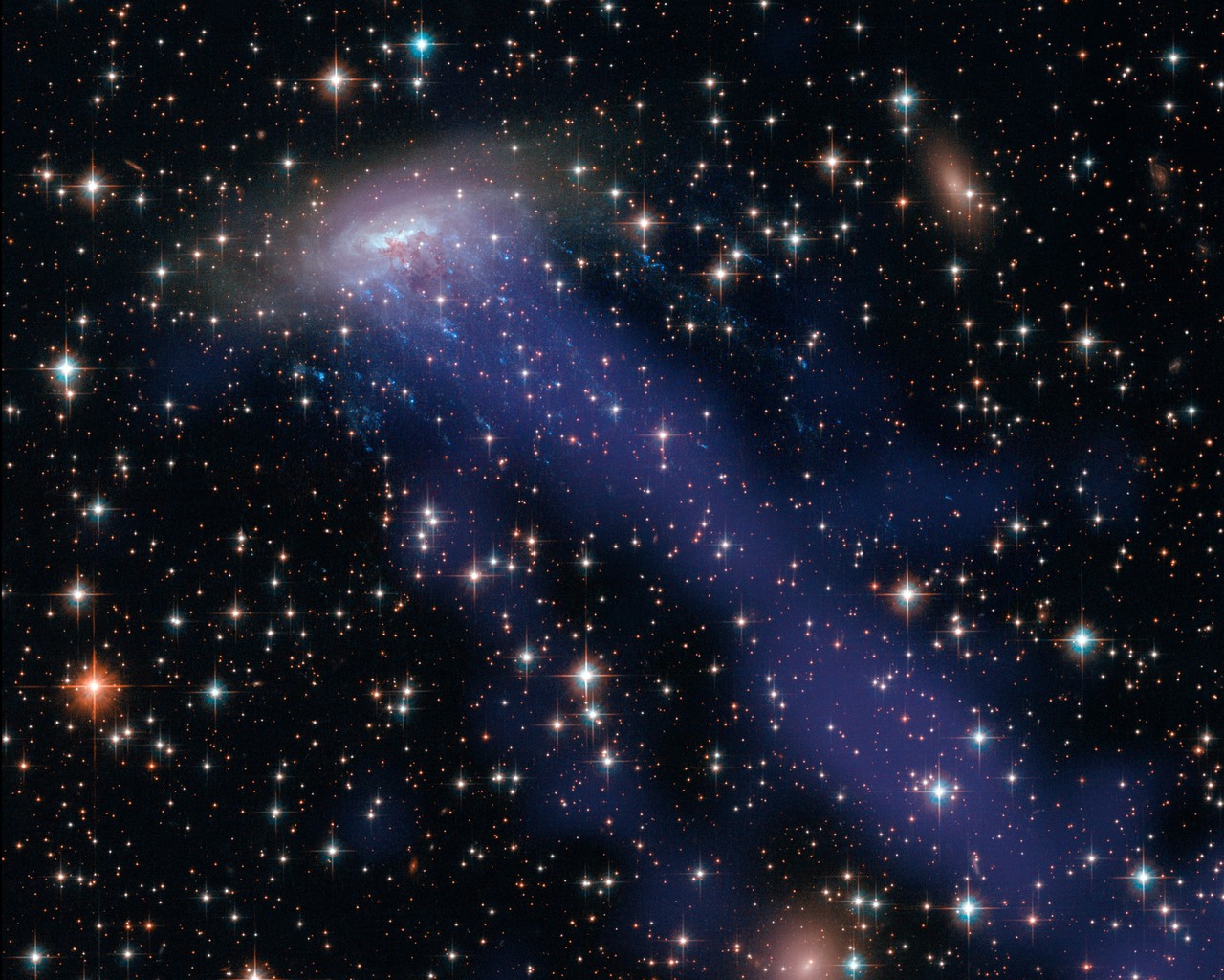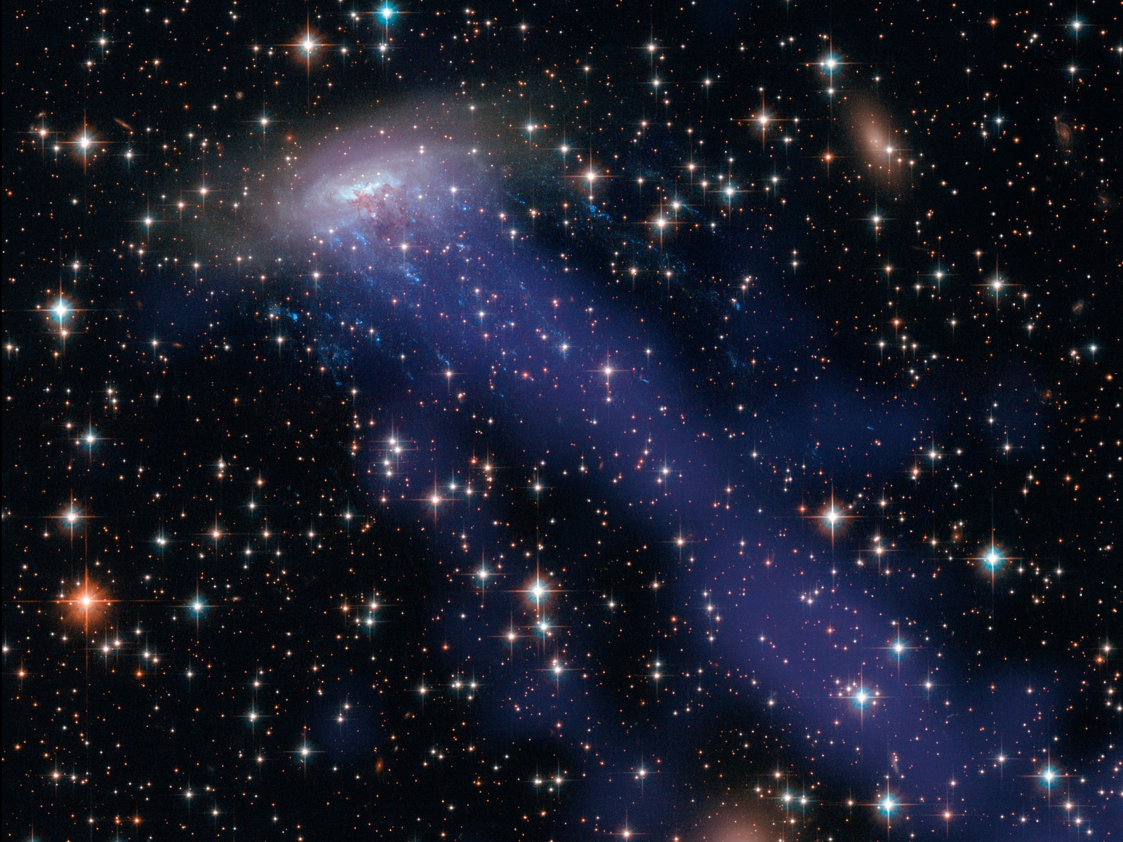 ESO 137-001 is a spiral galaxy travelling through the heart of a cluster of galaxies called Abel 3627. As it moves, the pull of the surrounding galaxies is tearing at it from all sides. Bright blue streaks are being torn from it, leaving behind tell-tale clues to this cosmic crime. Upon closer inspection, these blue streaks are rows of hot, bright, young stars.