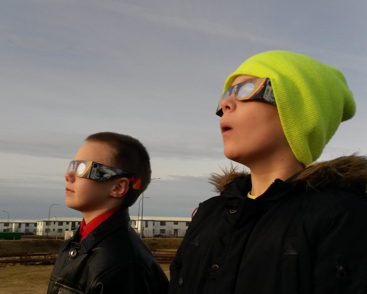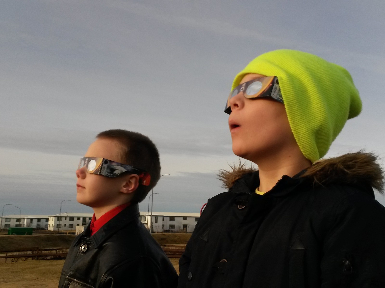 Two boys watch the solar eclipse in Iceland through solar-viewing glasses. March 2015
