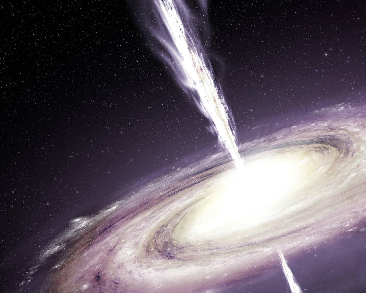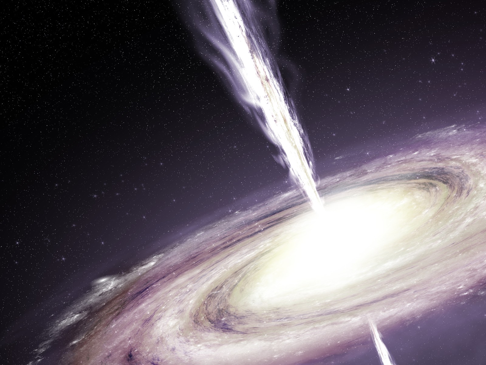 A quasar is gas-guzzling supermassive black hole. An artist created this picture to show us how these exotic objects might look up close. The bright jets of energy shooting outwards are bright enough to be seen across most of the Universe.
