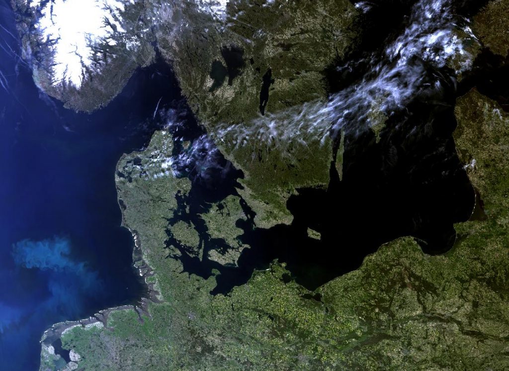 The photograph, by the Sentinel-3B satellite, captures a rare, cloud-free day over Northern Europe. Can you spot the snow-covered mountains in Norway or a plume of phytoplankton in the North Sea?