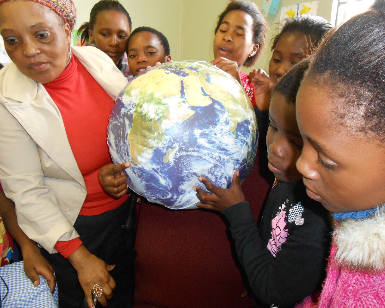 Learners pointing out Cape Town using the Earth Ball